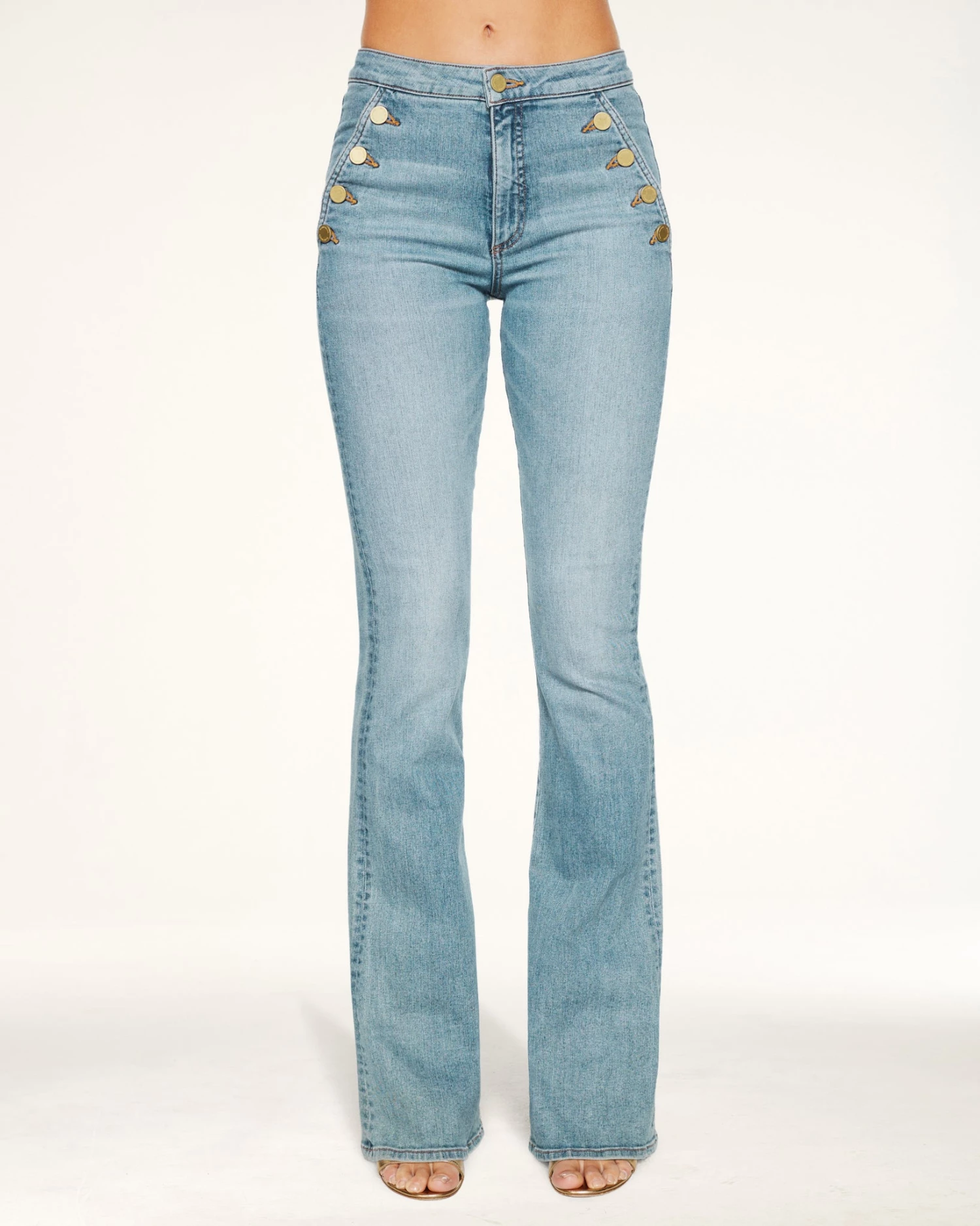 Our Helena High-Rise Flare features the fit of our best-selling Cindy Jean with sailor button details and a 70s style edge. Subtle distressing at the center of the thigh shapes your silhouette to look slimmer in all the right places. The slim-fit style has been carefully constructed to achieve a smooth flare shape without bunching at the knee, making your legs look miles long. Crafted from comfort stretch, Japanese denim that holds you in while still allowing you to move and groove through your do-it-all days.