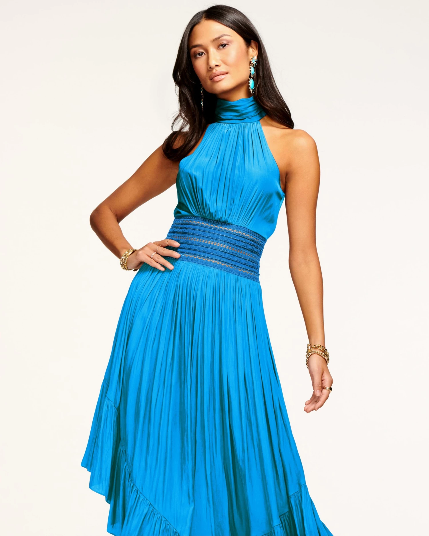 The higher the neckline, the greater the impact. Our Monique Dress, crafted in elevated Japanese tech fabric, is a sweeping mid-length gown designed with the fashion lover in mind. This gently pleated frock has an impactful asymmetrical skirt, but it’s the multi tonal cinched waist with lace detail that truly makes this piece a showstopper.
