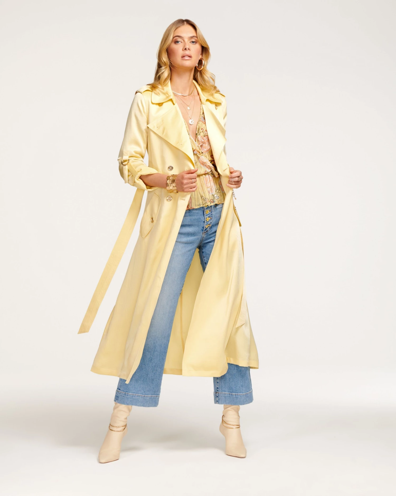 Trench yourself in the soft satin Aston Jacket, our modern take on the classic trench coat. The mid-length silhouette gives an air of mystery, while working glossy buttons and adjustable sleeves elevate this transeasonal style.