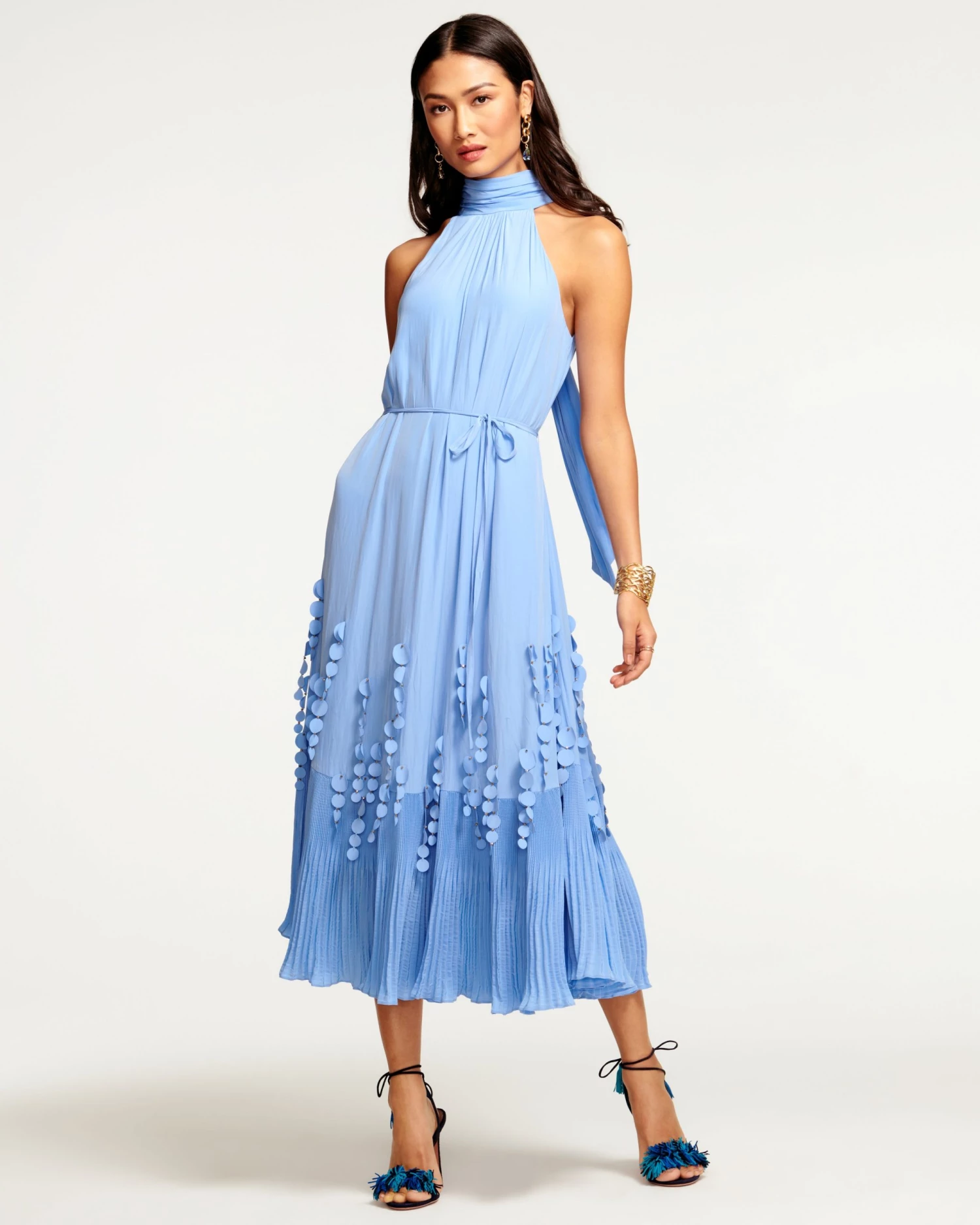 Embrace your waist with the Eliza Dress, a high-collared, long dress that features circular details and light pleating in a flattering Crepe de Chine. You’ll be thankful to have this delicately detailed dress in your closet when the next big event approaches.