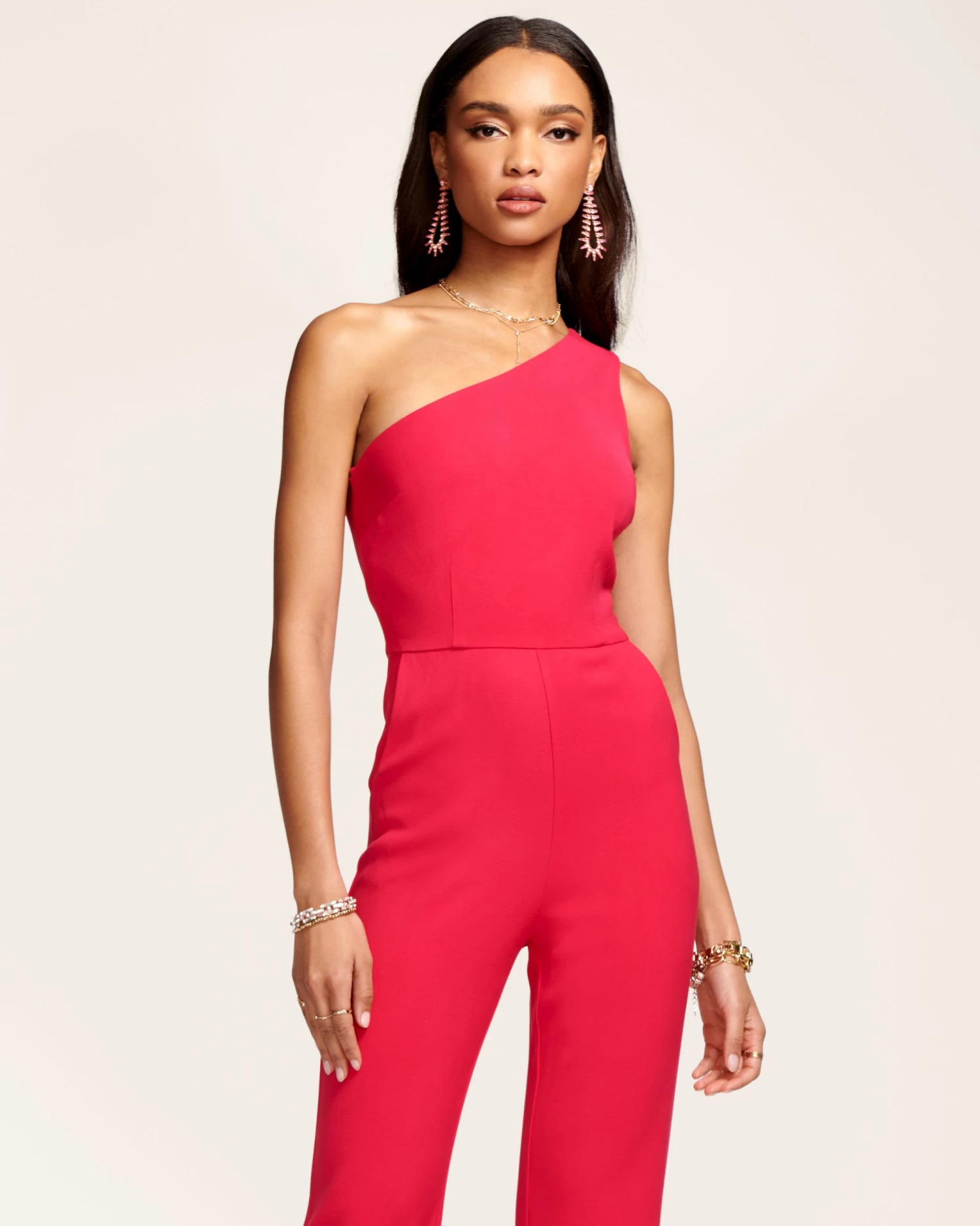 Our Exclusive Gabriela Jumpsuit takes the guesswork out of day and nightwear with its modern one shoulder bodice best enhanced by a statement earring. The elegant trouser bottom provides a fitted form that’s sure to have you walking tall when paired with a statement heel.