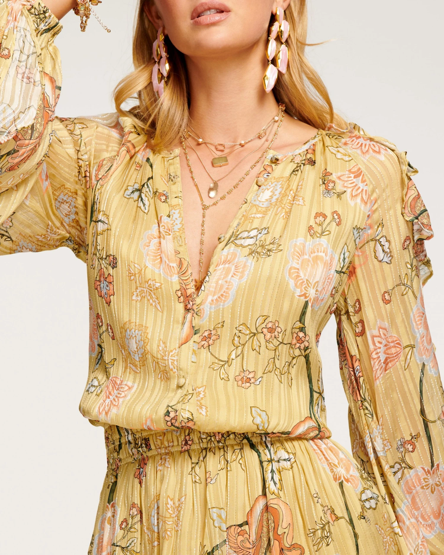 - Model Measurements: Height 5’10” / Bust 34″ / Waist 24″ / Hips 35″