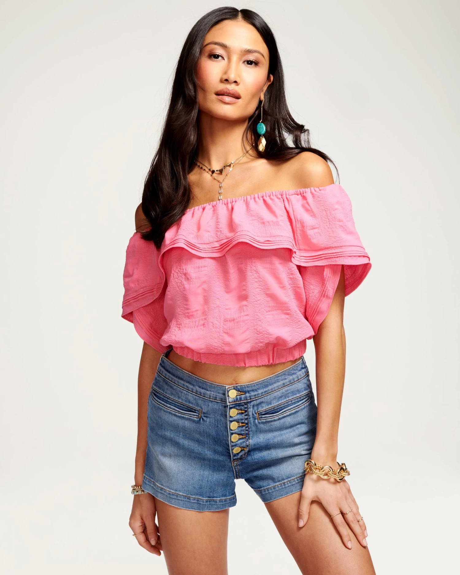Put the spotlight on your inner girly girl by slipping into our Rita Top, a picture perfect summertime staple crafted in puckered plaid. The off the shoulder neckline is designed with a tiered overlay, a dimensional touch that elevates this classic style. Paired with the cropped silhouette, this cheerful top pairs just as well with denim as it does with leather trousers for a style that evolves with you.