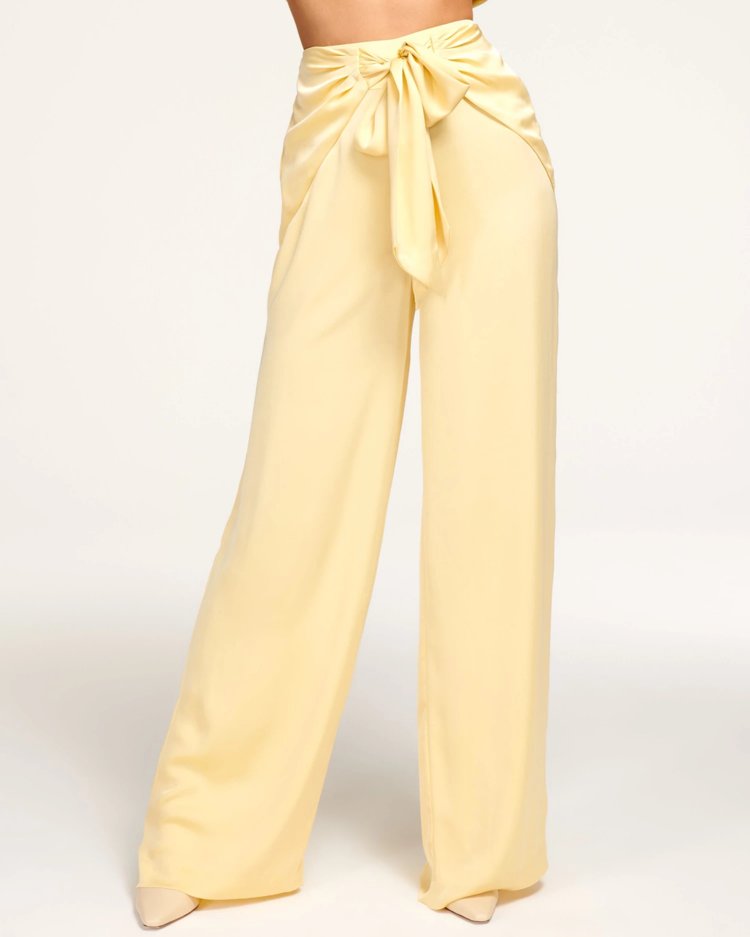 Our mystical Exclusive Margo Pant delivers an unexpected spin on a classic silhouette. Crafted with silky satin charmeuse, these luxe trousers have a contemporary tie at the waist that contrasts beautifully against the long, loose trouser. Wear with a fitted top for your next upscale dinner and you’ll feel like a million bucks. Shop the look: Cheryl One Shoulder Crop Top