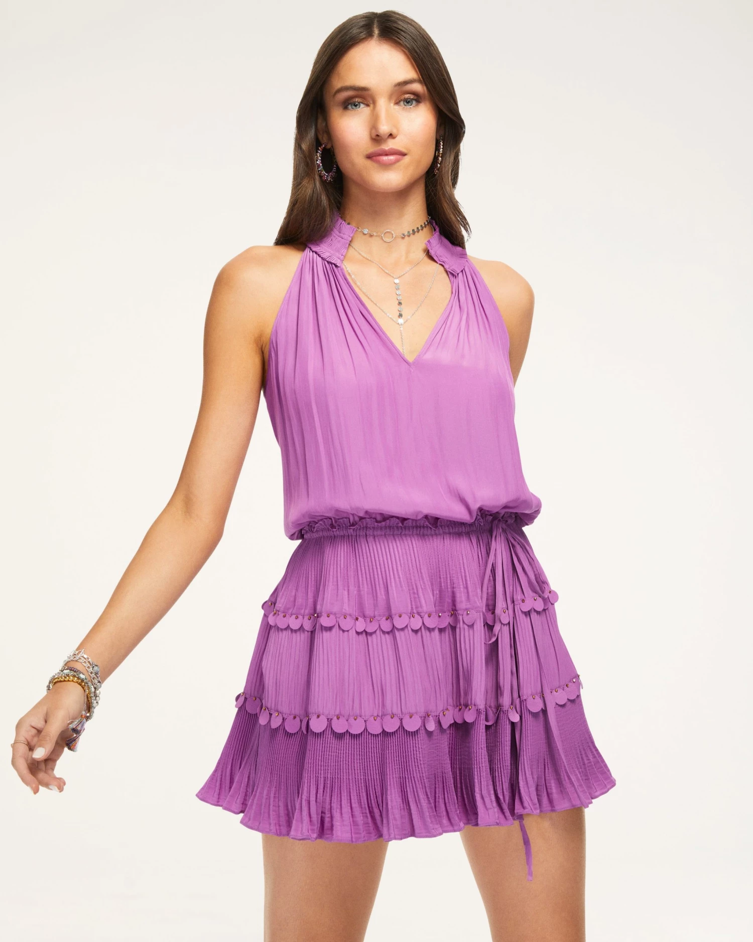 Sit pretty in petunia in the Aaron Dress, the perfect piece to dress up or down no matter the occasion. Make the most of the open collared, v-neckline by pairing with your go to statement necklace, while the pleated skirt on this slightly dropped waist silhouette will carry you through any event in style.