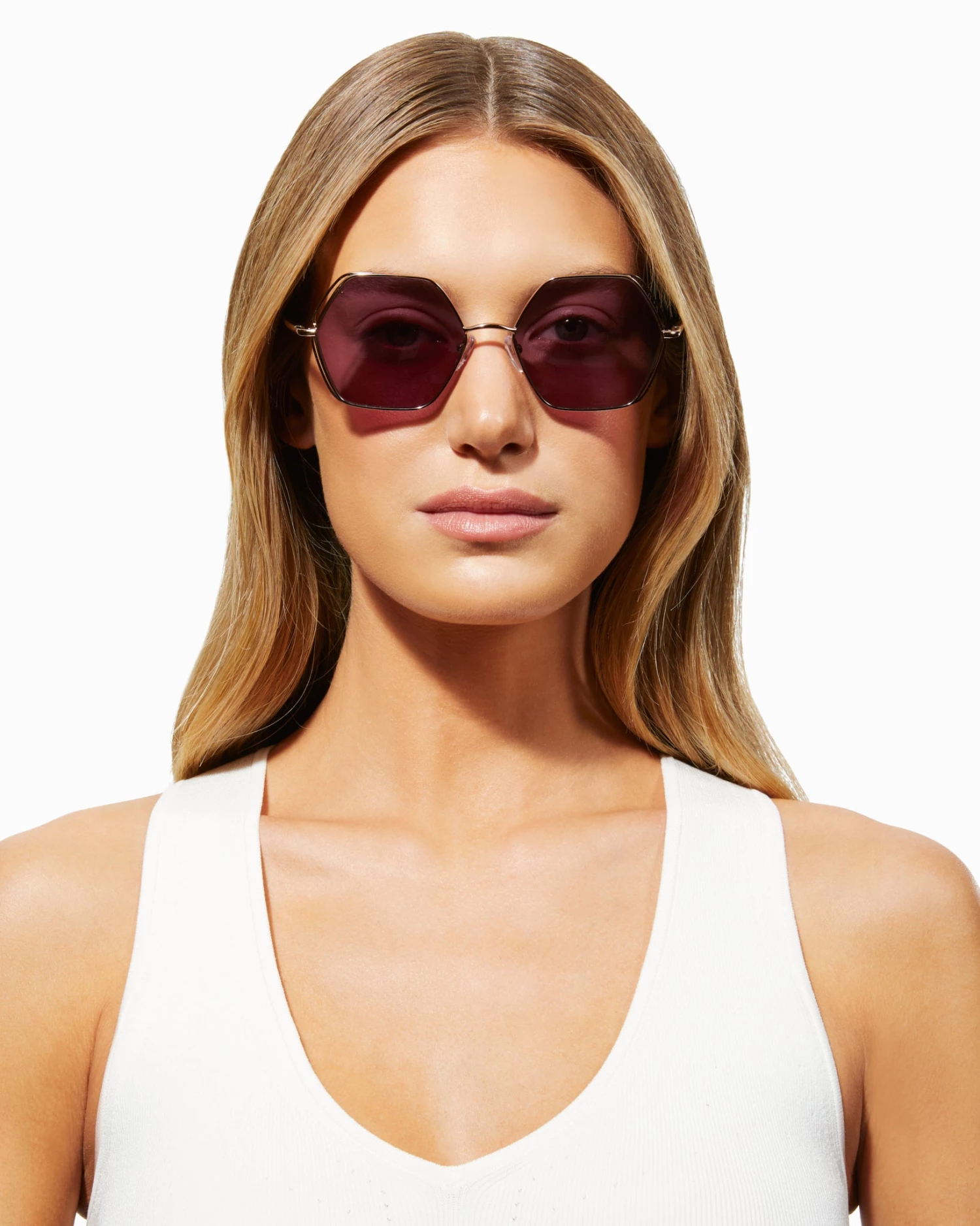 Radiate disco vibes in the 70’s-inspired St. Tropez. The rose gold hexagon frame is double rimmed and encases deep rose lenses that will instantly transform you into a retro party queen. Style them with our white High-Rise Cindy Denim for a head-to-toe vintage ensemble or slip them on at the beach while donning our Rhona Coverup.
